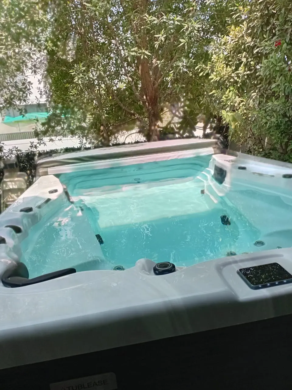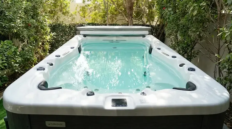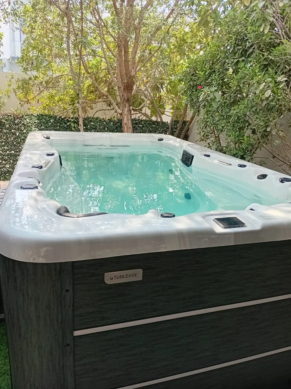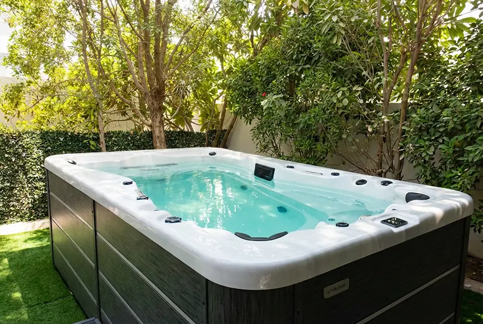 A modern outdoor hot tub with clear blue water sits on a green lawn, surrounded by lush trees and bushes in a private Dubai garden setting.