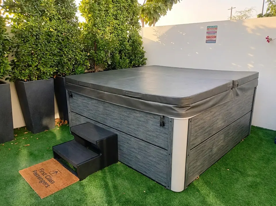 A modern outdoor hot tub filled with water sits on artificial grass in a lush garden, surrounded by tall potted plants and a white privacy wall. Steps lead up to the tub, with a folded cover and welcome mat nearby—perfect for Dubai evenings.