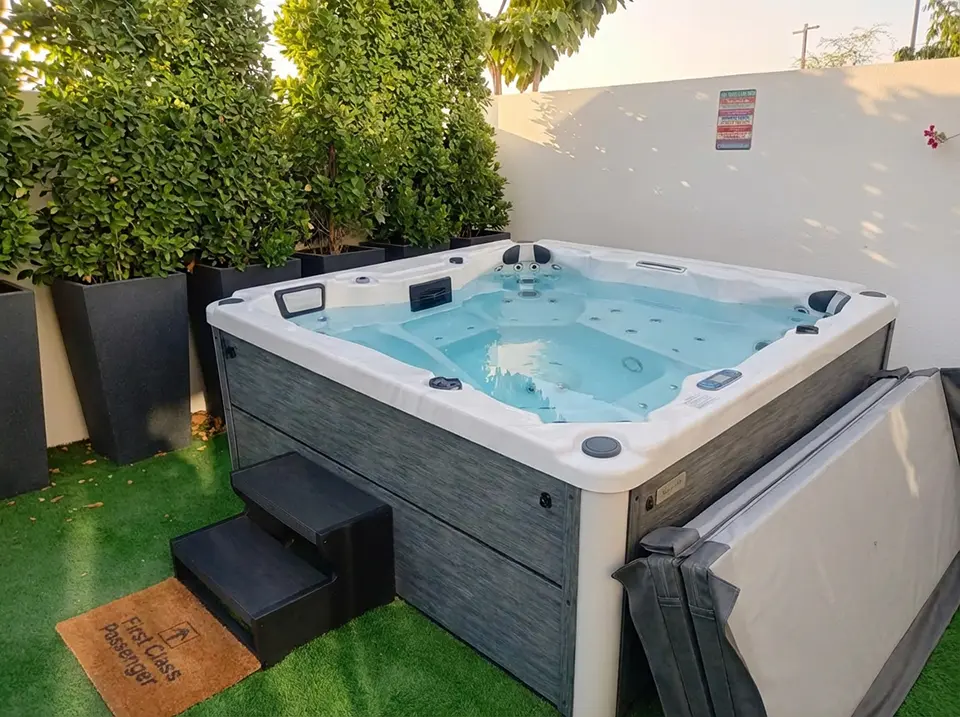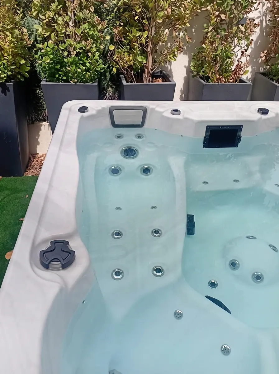 A close-up view of a modern outdoor hot tub with clear water, featuring multiple water jets and grey controls—perfect for relaxing evenings in Dubai. Potted green plants are lined up along a white wall in the background.