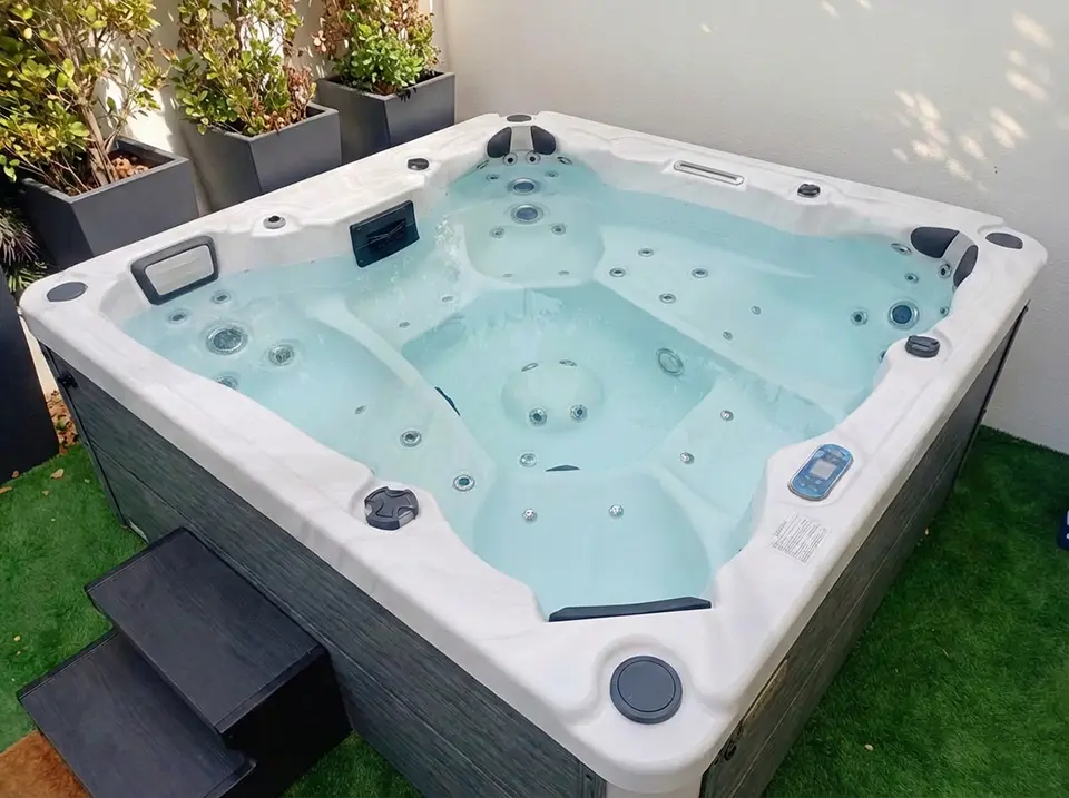 A modern outdoor jacuzzi with clear water, built-in seats, and multiple jets sits on artificial grass in a stylish garden near potted plants and a white wall; black steps lead up to the tub.