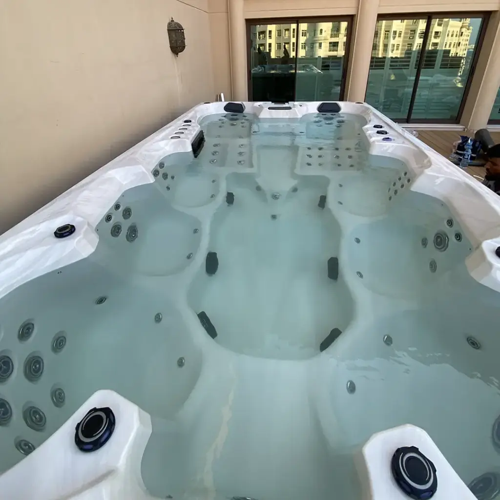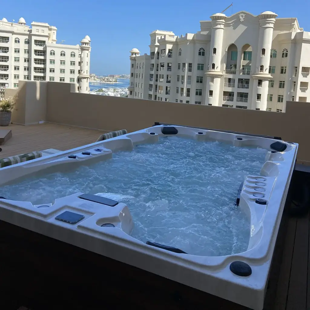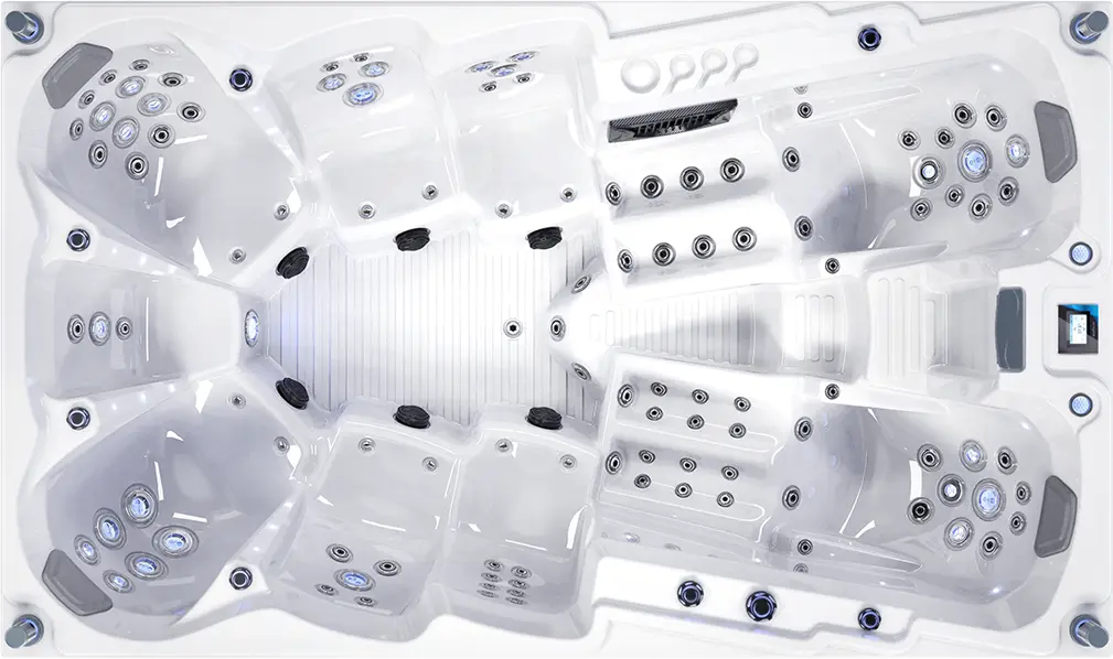 Embark on an extraordinary journey of lavishness with our exceptional 9-person hot tub. Designed for the ultimate indulgence, it features two luxurious loungers and seven inviting seats, providing an unrivaled space for relaxation. Crafted with the utmost attention to detail and using the finest materials, it epitomizes opulence and sophistication. An optional water chiller can provide a cool dip in hot summers.
